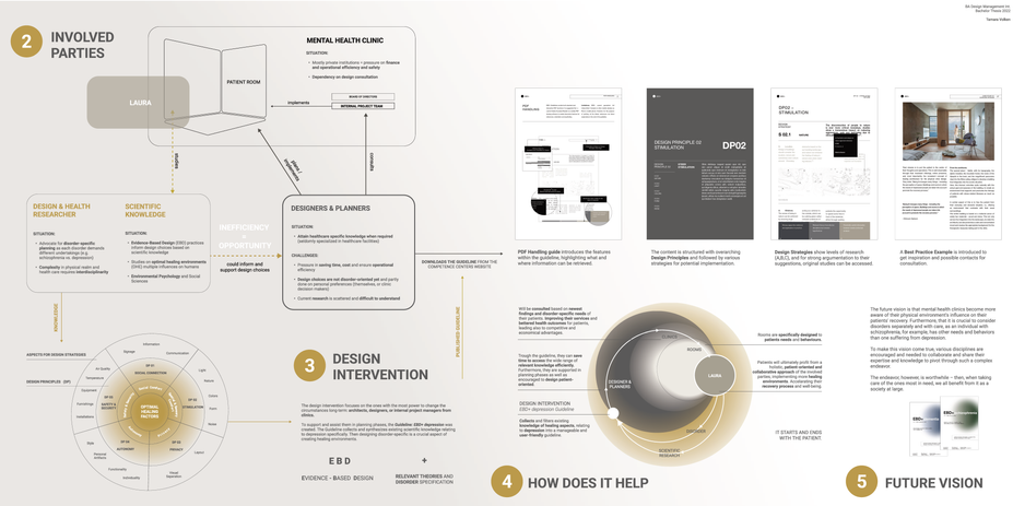 "EBD+ depression" guideline - an interactive PDF that aims to empower architects and designers with evidence-based design data and disorder-specific knowledge early in their design processes. It is structured along overarching design principles (nature, safety, stimulation, etc.), followed by design strategies for implementation suggestions. It is delivered comprehensively and user-friendly to enhance knowledge transfer to the respective stakeholders who actually hold the power to change the given circumstances.